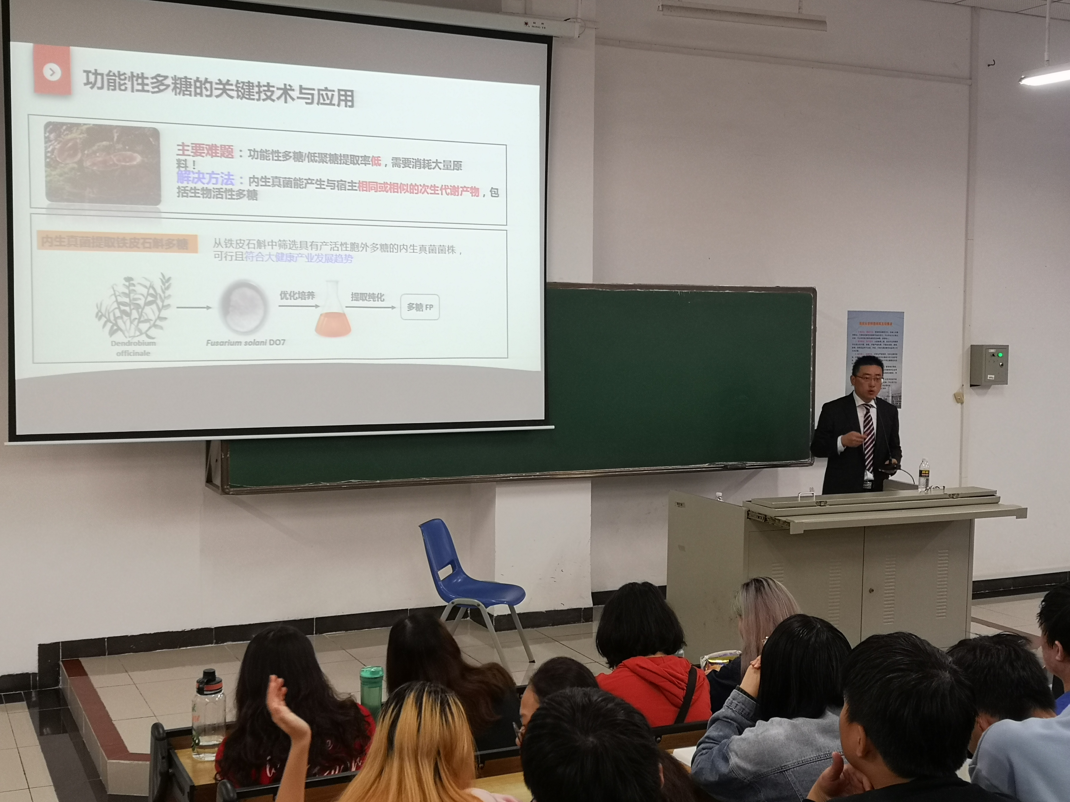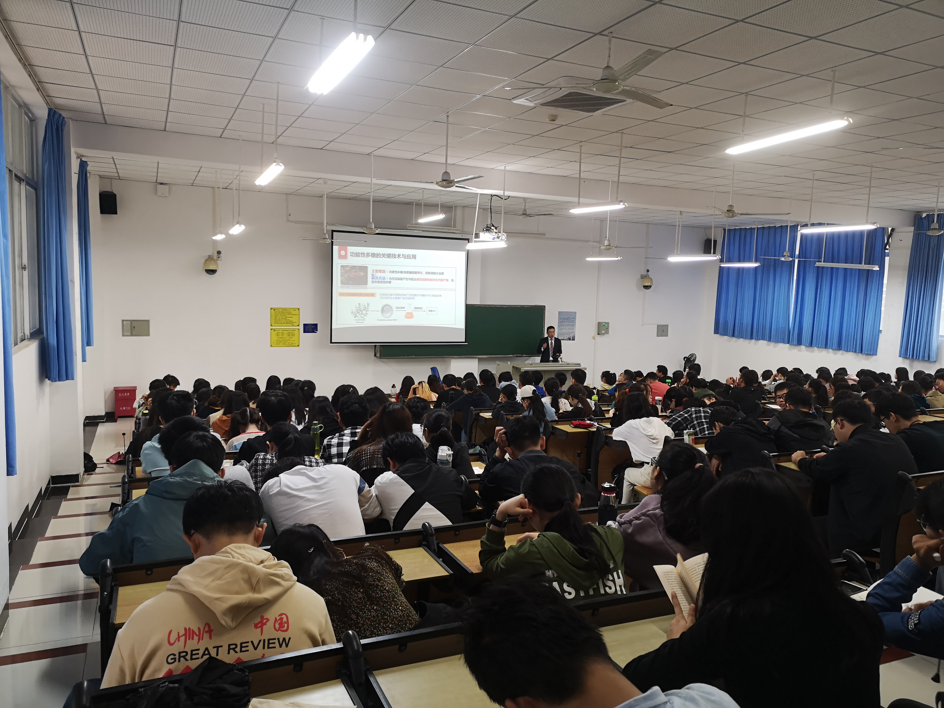 娄老师以风趣幽默、课堂互动相融合的讲座方式,结合我国大健康产业发展的大数据,首先为同学们展望了健康产业的发展趋势:1)健康产业大数据分析;2)食品功能因子的研究进展;3)总结展望。随后,娄老师从我国慢性疾病的研究数据出发,结合健康营养的食品消费观以及国家的发展战略,分析了健康中国带来的机遇和挑战。最后,娄老师围绕生物催化过程调控与应用,从生物催化的研究背景,到关键科学问题的提出,结合近几年的研究成果,由浅入深的讲解了:1)生物催化剂的定向创制和应用;2)微生物底盘细胞的构建与应用;3)酶固定化体系的构建及其高效催化应用;4)离子液体强化生物催化过程。同学们认真听取了娄老师精彩的报告,课堂氛围活跃,取得了良好的效果,老师们和同学们均受益匪浅。