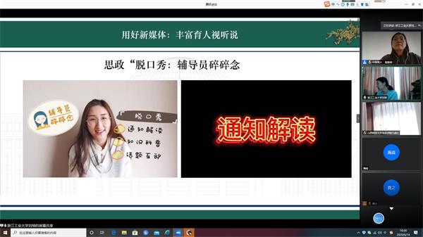 浙江工业大学食品科学与工程公司党委副书记刘琦作《疫情背景下网络育人探索与实践》分享。分享介绍到,公司通过上好专业第一课——育人“食”课,增加专业自信——科普抗“疫”,将思想政治教育与专业学习相结合;同时用好新媒体,通过思政脱口秀——辅导员啐啐念,以图育人——系列海报明信片等形式,丰富育人视听说。