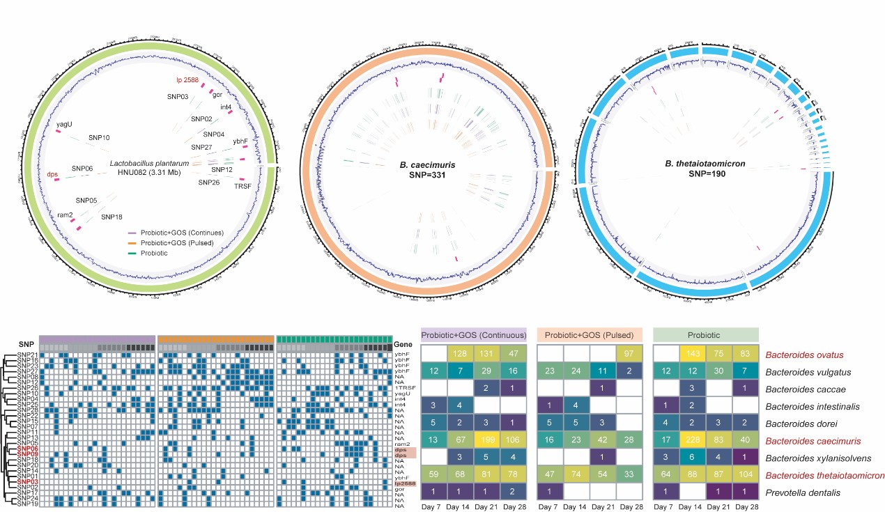 稳定的肠道微生物组是维系宿主健康的关键因素。目前尚不清楚在益生菌的补充过程中,益生元如何改善肠道微生物组的系统稳定性。本研究以植物乳杆菌HNU082为试验菌株,采用Shotgun宏基因组测序技术,采用连续或脉冲方式补充低聚半乳糖,观察对小鼠肠道微生物组稳定性的影响。研究结果表明,在竞争条件下不断补充低聚半乳糖,能有效促进益生菌的稳定定殖,降低其基因组突变位点数量。同时,可增加肠道微生物组生态稳定性,缓和益生菌与本地菌群中拟杆菌属各个菌种的激烈竞争。因此,低聚半乳糖的补充可加速益生菌与宿主肠道微生物的协同进化。