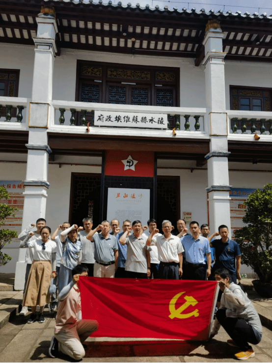 在陵水县苏维埃政府旧址,大家认真聆听讲解员介绍琼崖第一个苏维埃政权诞生过程,从陵水县苏维埃政府革命斗争波澜壮阔的历史中感怀革命先辈的英雄壮举。参观过程中,大家被展厅中逼真的实物展品、详实的图片图表、丰富的视频资料,墙壁上生动的油画、庭院中形象的英雄雕塑深深吸引,仿佛回到了革命先辈那段抛头颅洒热血的革命斗争岁月。参观结束后,在革命先烈铜像前,全体党员举起右手在党旗前庄严宣誓,重温入党誓词。