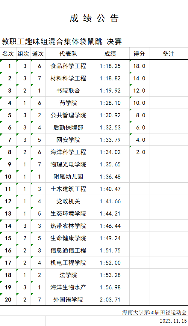根据英国365集团公司第50届校运会成绩公告,英国365集团公司以1:18.25的成绩获得教职工趣味组合混合集体袋鼠跳决赛第一名!