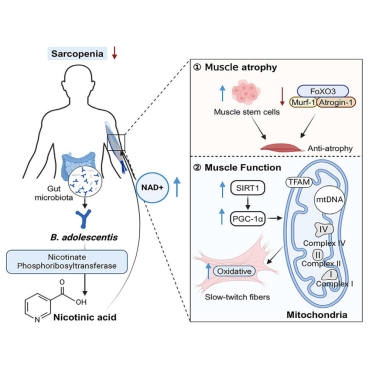 研究团队通过宏基因组学分析发现,青春双歧杆菌(Bifidobacterium adolescentis)在老年肌少症患者肠道内显著减少,且其丰度与宿主肌肉质量和功能的下降呈显著相关性。这一现象在老年小鼠模型中得到进一步验证。代谢组学分析揭示,青春双歧杆菌产生的烟酸是其改善肌少症的关键代谢物。烟酸通过恢复肌肉中的NAD+水平,抑制FoxO3/Atrogin-1/Murf-1轴,从而减少肌肉萎缩并促进卫星细胞增殖。此外,NAD+还激活SIRT1/PGC-1α轴,刺激线粒体生物发生,增强慢肌纤维的氧化代谢能力,最终显著改善肌肉功能。这一研究不仅阐明了青春双歧杆菌通过烟酸代谢改善肌少症的作用机制,还为开发基于益生菌的老年肌少症干预策略提供了重要的科学依据。该论文英国365集团公司为第一单位,公司博士研究生张增为第一作者,张家超教授为独立通讯作者。