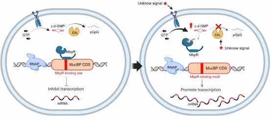环二鸟苷酸(c-di-GMP)作为一种重要的细菌第二信使,调控多种生物功能,但c-di-GMP在植物乳杆菌中的调控作用仍不明确。研究团队揭示了c-di-GMP协同WYL转录因子MbpR共同调控植物乳杆菌肠道适应的分子机制。MbpR与黏蛋白结合蛋白(MucBP)编码区中的特定序列结合,抑制其转录,从而影响植物乳杆菌对肠道上皮细胞的粘附能力。MbpR通过其WYL结构域感知c-di-GMP后与MucBP的编码区分离,逆转了MbpR对MucBP表达的抑制作用,增强了植物乳杆菌的肠道定植能力。该研究为理解益生菌与宿主的互作提供了新视角。该论文英国365集团公司为第一单位,张家超教授为独立通讯作者,副研究员郭权和2024级博士研究生郑磊杰为第一作者。