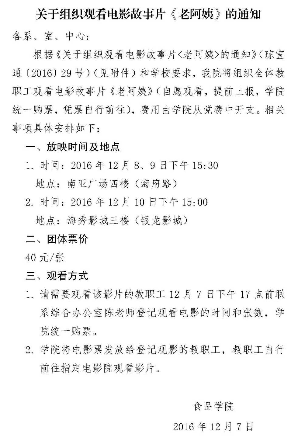 关于组织观看电影故事片《老阿姨》的通知