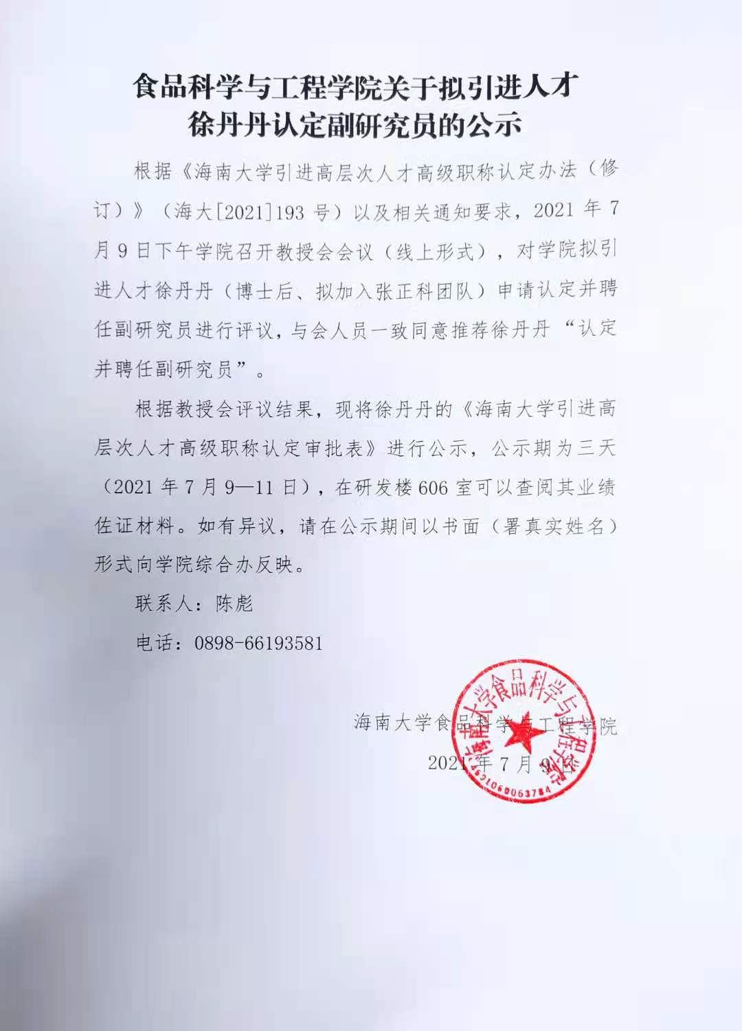 公司关于拟引进人才徐丹丹认定副研究员的公示