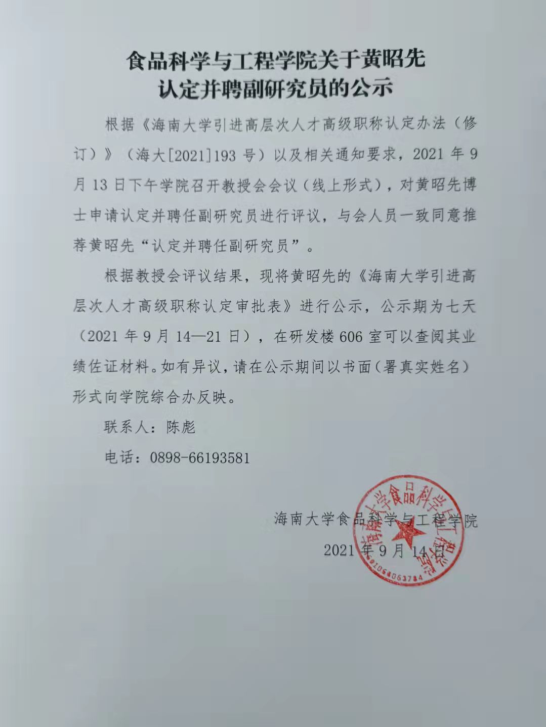 公司关于黄昭先认定并聘副研究员的公示