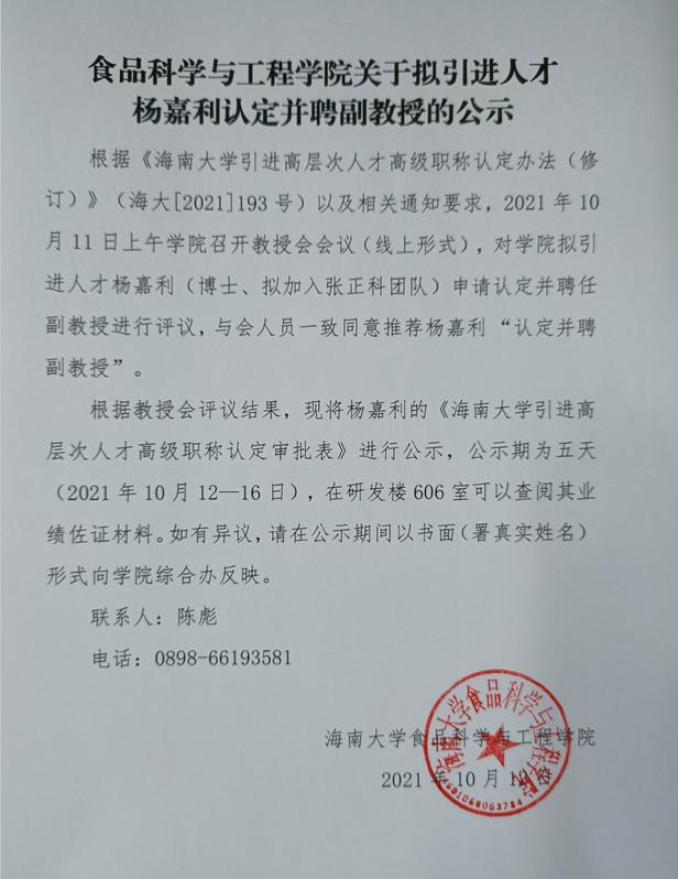 公司关于拟引进人才杨嘉利认定并聘副教授公示