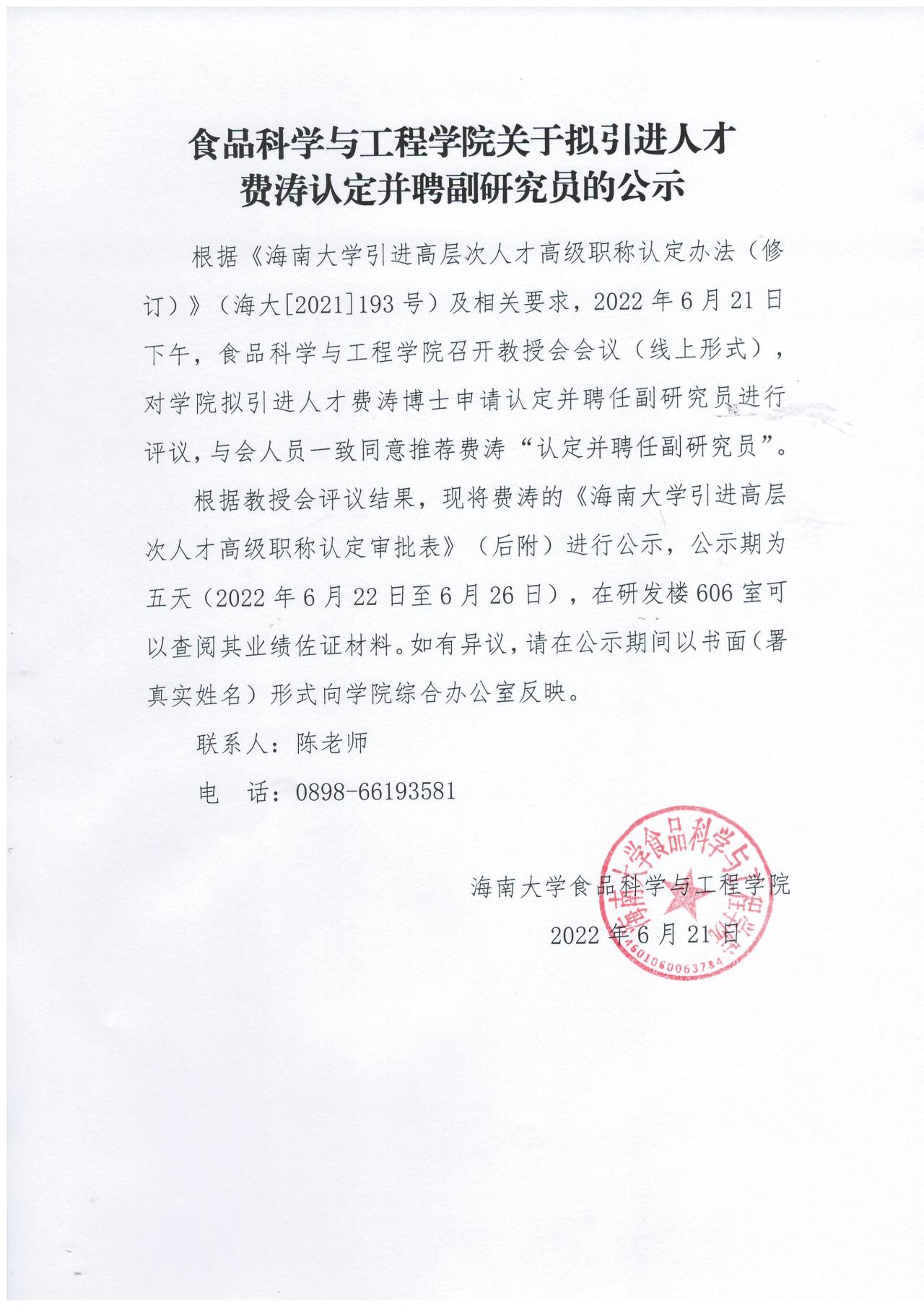 公司关于拟引进人才费涛认定并聘副研究员公示