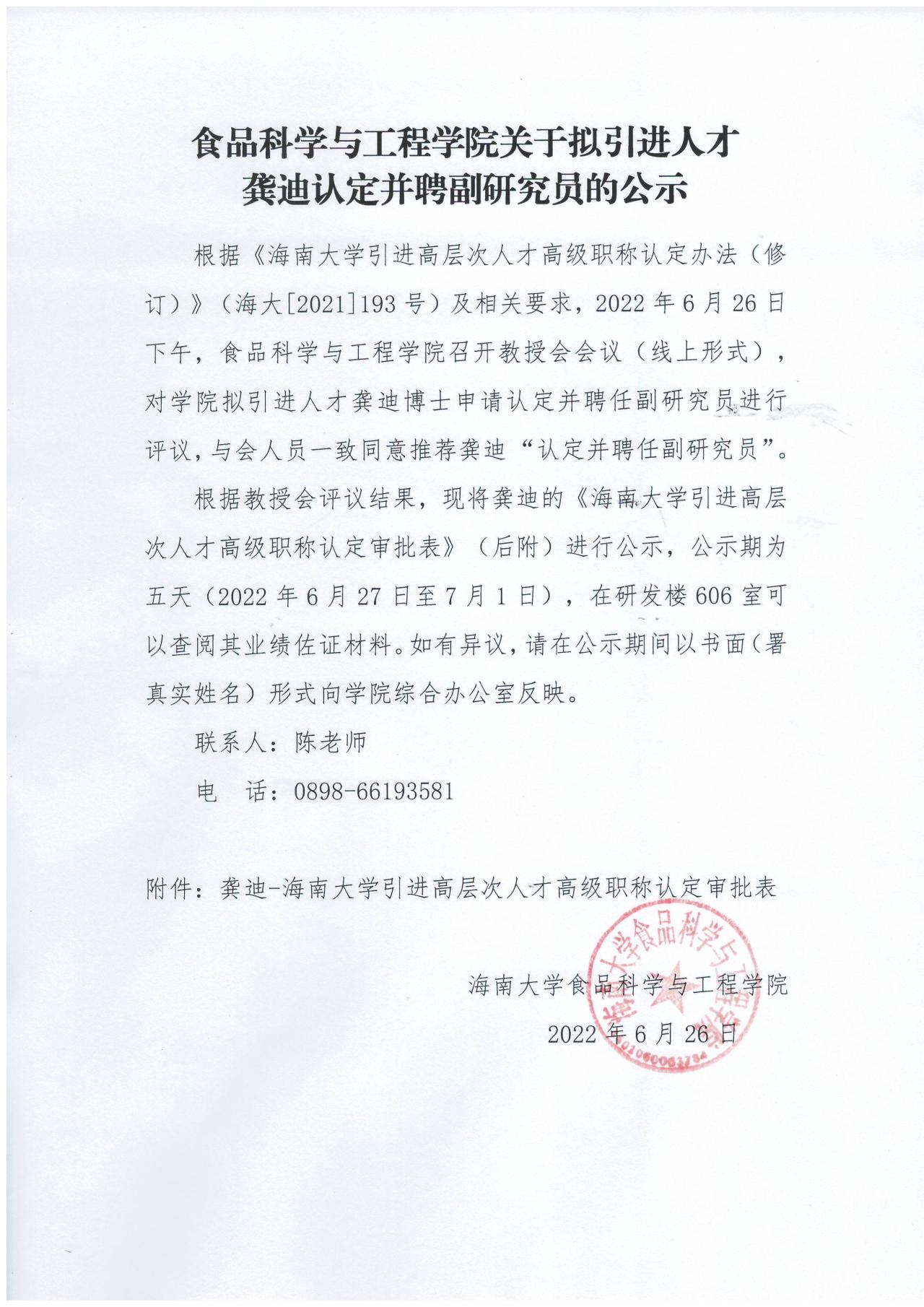 公司关于拟引进人才龚迪认定并聘副研究员公示