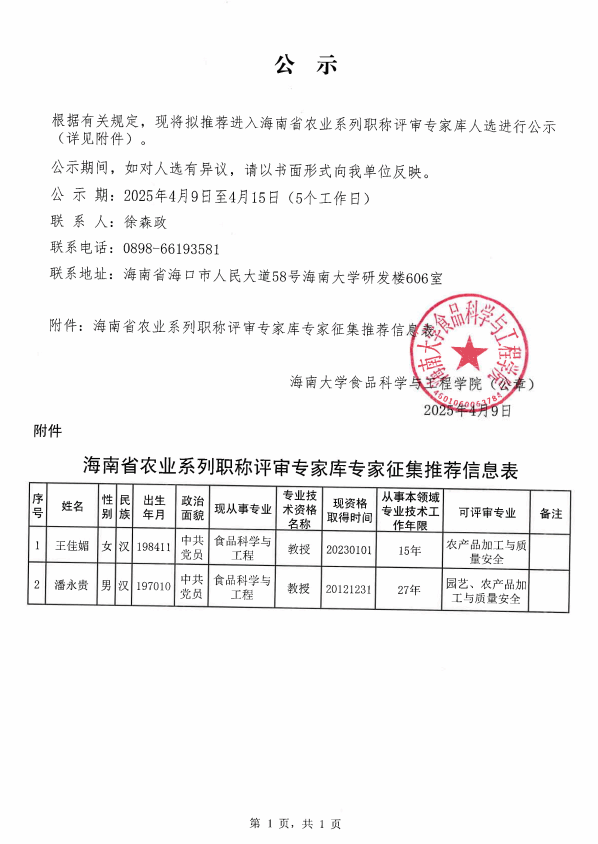 海南省农业系列职称评审专家库专家推荐名单公示